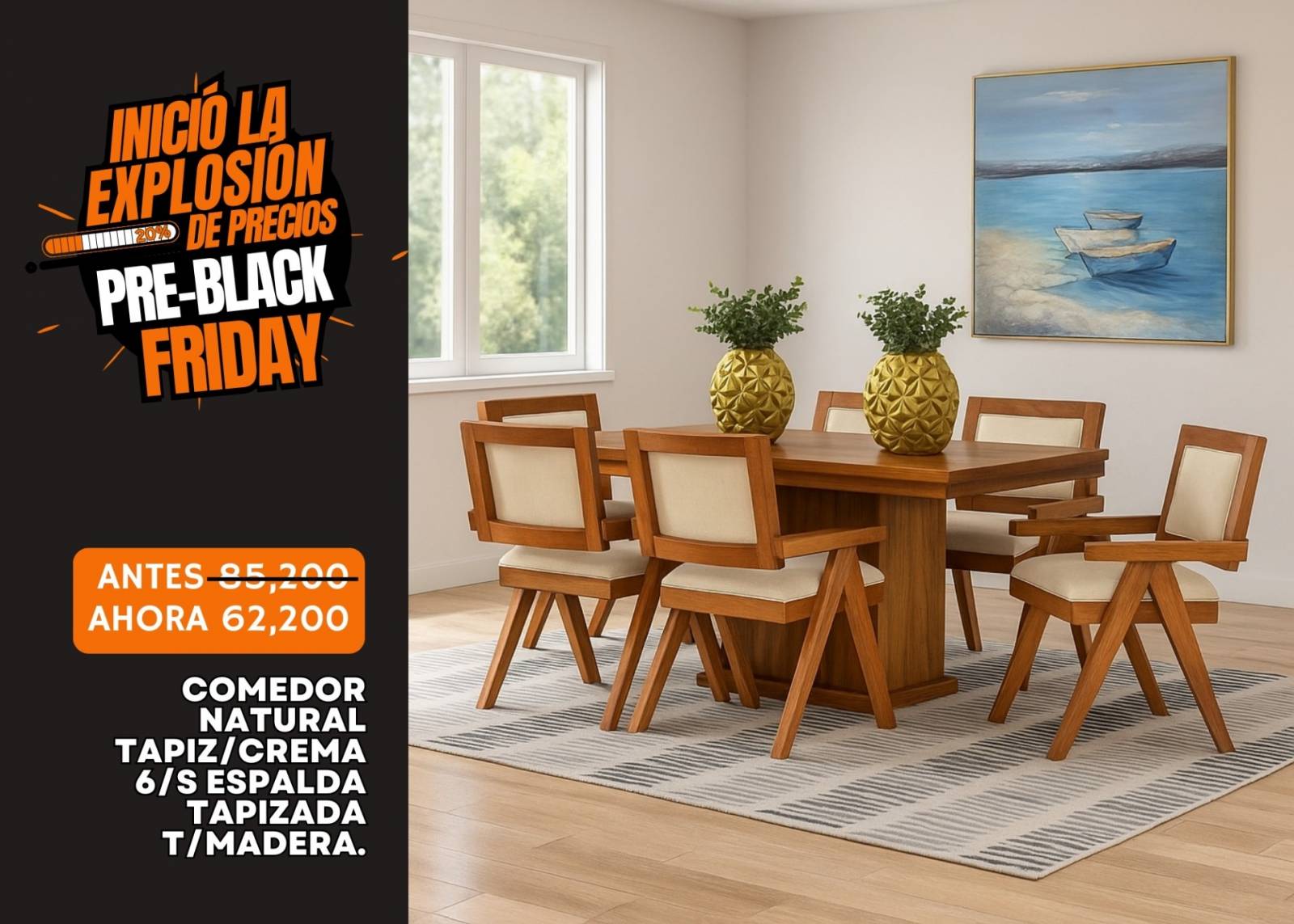 COMEDOR BUCAREST NATURAL DE 6 SILLAS TAPIZADO CREMA, TOPE DE MADERA NATURAL CON BLANCO, EN CAOBA AFRICANA, CON UN ESTILO MODERNO Y DIFERENTE, PERFECTO PARA DARLE A TU HOGAR ESE TOQUE MODERNO Y UNICO QUE ANDAS BUSCANDO.